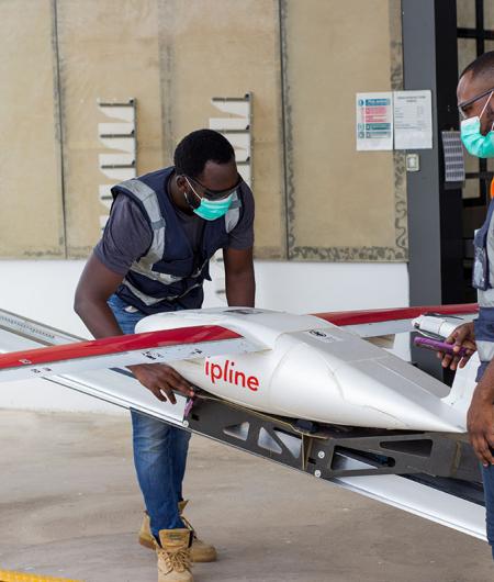 Below: Workers prepare a Zipline UAS for a medical flight in Ghana. Photo: Zipline