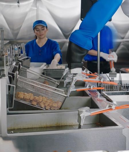 Each of these features allow Flippy to help with picking up baskets and placing them in the fryer, gently shaking baskets in the oil and monitoring cooking time. These features also allow Flippy to hang baskets to drain excess oil, place them at a designated station for temperature testing and skim the fry oil. Also, it will never be tempted to sneak a tot or chicken tender.