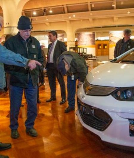 Photo below: Jay Harris, 77, of Plymouth and The Henry Ford antique vehicle specialist Gordon Michael, 66, of Oak Park check out GM's first self-driving Bolt EV while GM President Mark Reuss speaks in the background Tuesday at the Henry Ford Museum in Dearborn. (Photo: Mandi Wright, Detroit Free Press)