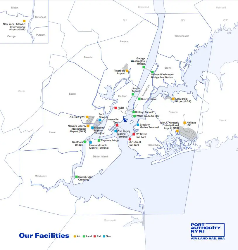 The Port Authority oversees much of the region’s air, land, rail and maritime transportation infrastructure network, including: John F. Kennedy International Airport (JFK), LaGuardia Airport (LGA), and Newark Liberty Airport (EWR); the Port of New York and New Jersey, one of the largest and busiest port systems in North America; in addition to major tunnels and bridge crossings within the Port District, which spans a 25-mile radius around the Statue of Liberty.