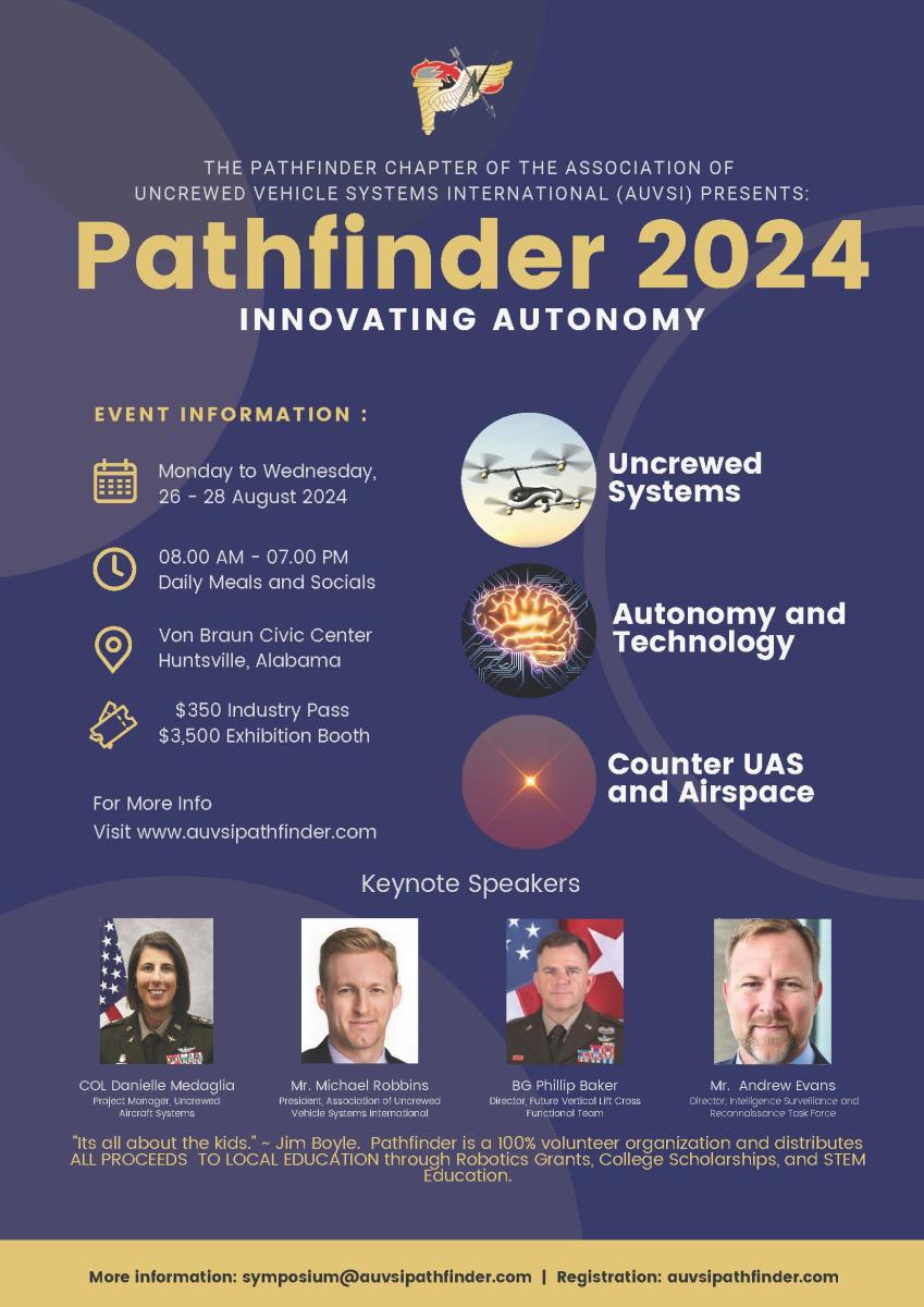 Discover the forefront of technological innovation at the Pathfinder Symposium 2024, hosted by the AUVSI Pathfinder Chapter, a leading non-profit organization dedicated to advancing Uncrewed and Autonomous Systems. From August 26-28, 2024, at the Von Braun Center in Huntsville, Alabama, this symposium brings together over 600 professionals from the Department of Defense, Federal Agencies, Industry, and Academia. It serves as a pivotal platform for exchanging insights on cutting-edge technology solutions, addressing capability gaps, and enhancing education in Uncrewed Systems, Autonomy and Technologies, and Counter UAS and Airspace integration. This year's theme, "Innovating Autonomy," invites attendees to explore groundbreaking solutions through dynamic discussions and hands-on demonstrations.