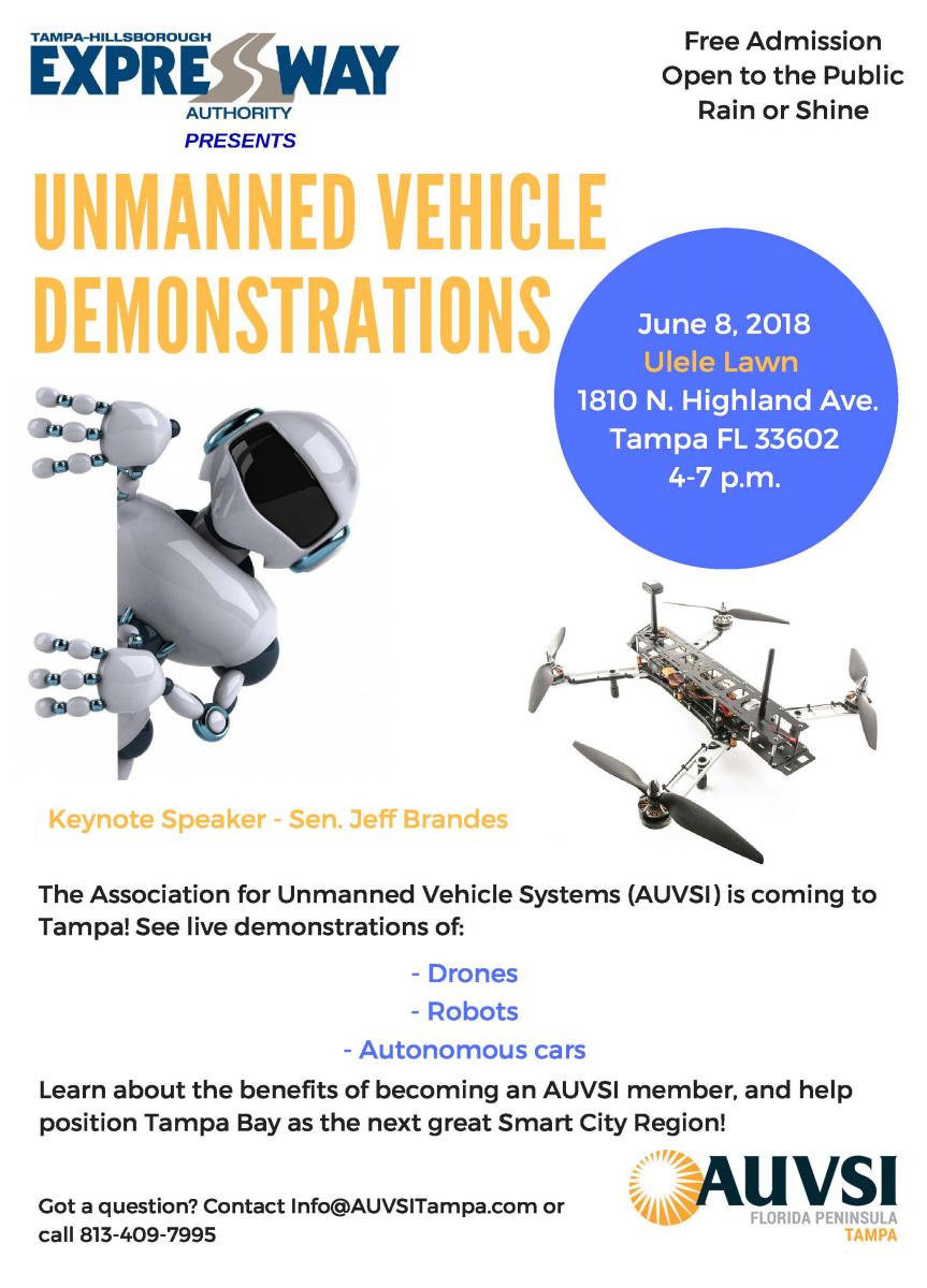 AUVSI Florida Peninsula - Tampa Kick-Off Friday, June 8, 2018 - 04:00 PM to 07:00 PM (EST)Event Contact: Andrew Wilson Contact Phone Number: (813) 409-7995 Contact Email: Info@AUVSITampa.com Learn More