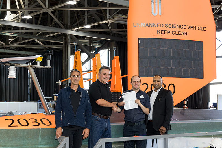 ABS presents the first Voyager class certificate to Saildrone. From L to R: Saildrone COO Mark Cuyler, Saildrone Sr. Project Manager Brendan Mullan, ABS Senior Surveyor, San Francisco Port Daniel Grossman, and Daryl Bangar, ABS Director of Business Development North America – Western.