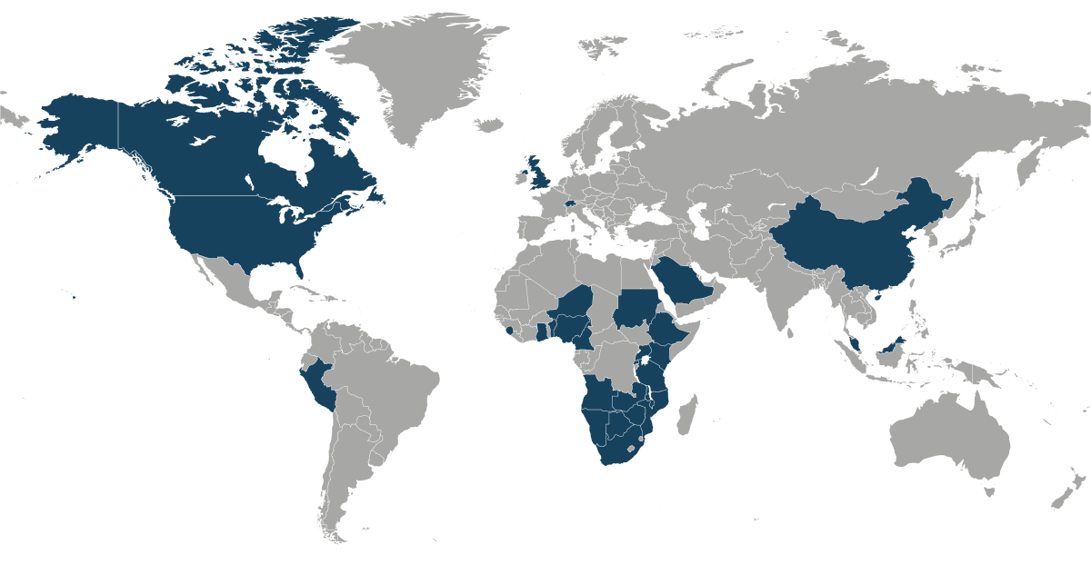 Countries include: Angola, Benin, Botswana, Cameroon, Canada, China, Ethiopia, Gambia, Ghana, Guam, India, Kenya, Malawi, Malaysia, Mozambique, Namibia, Niger, Nigeria, Peru, Rwanda, Saudi Arabia, Sierra Leone, South Africa, Sudan, Switzerland, Tanzania, Uganda, United Kingdom, United States, Zambia, Zimbabwe